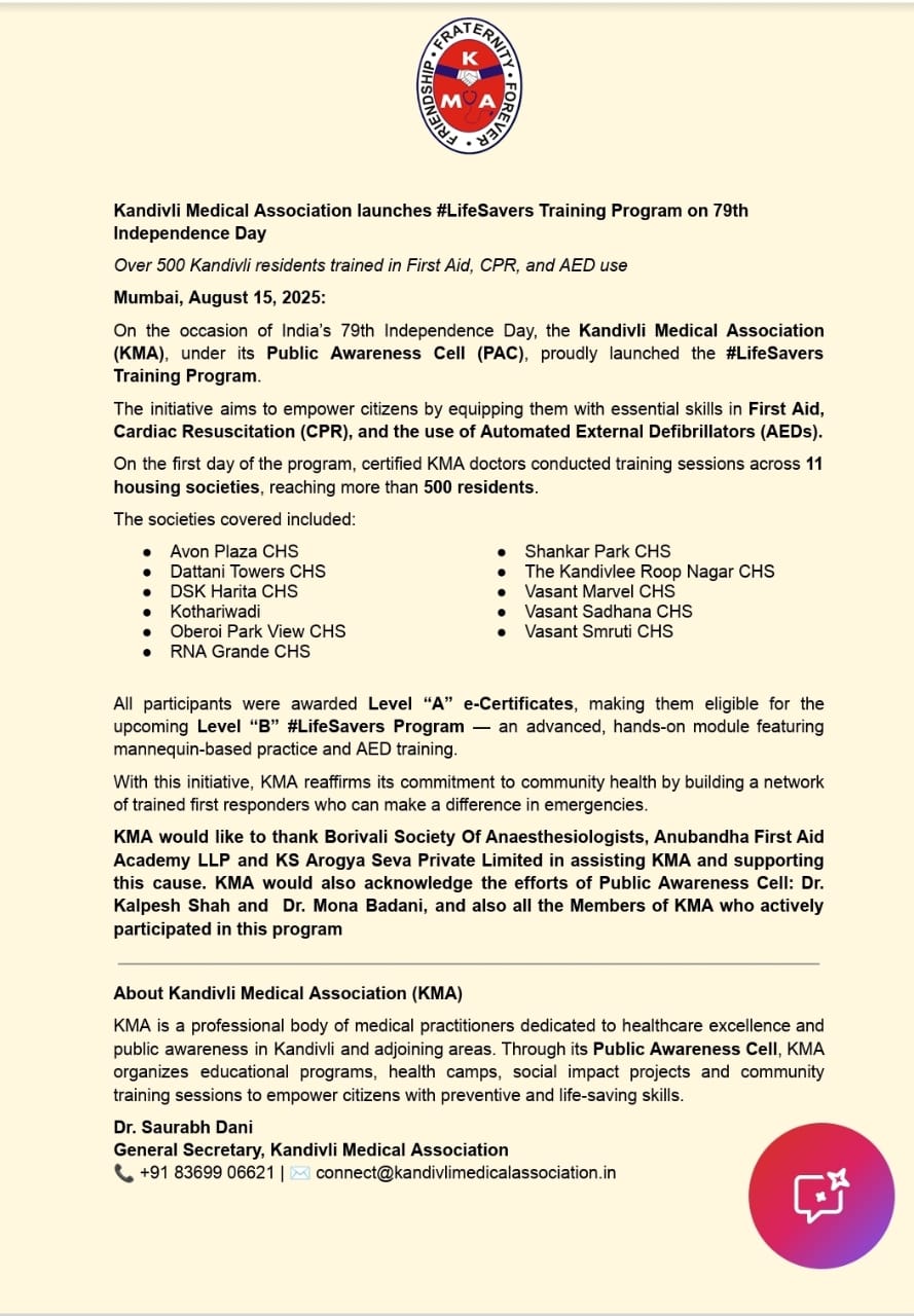 Dr Kalpesh shah and Dr Mona badani has successfully organised 12 different places – CPR and First AID training to residents of Kandivali on 15 August between 9 am to 12 pm…..